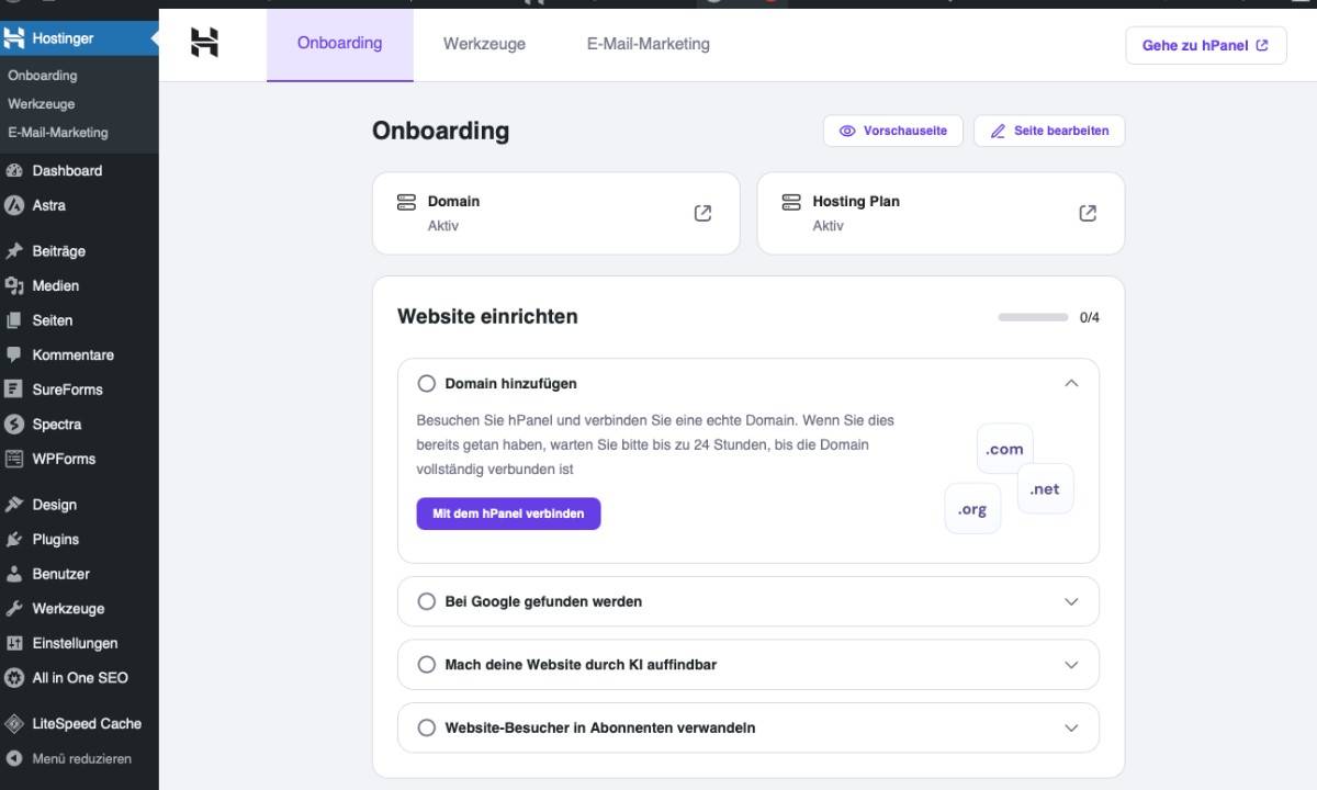 Nach kaum zehn Minuten waren die vorbereitenden Einstellungen sowie die anschließende WordPress-Installation abgeschlossen. Anschließend landete ich direkt im Backend meiner WordPress-Seite. Dort kannst du dir einen ersten Überblick verschaffen, dir etwa gleich einmal eine Voransicht deiner Website anzeigen lassen. Vom WordPress-Backend aus geht es auch in das oben erwähnte hPanel, also die Benutzeroberfläche von Hostinger.