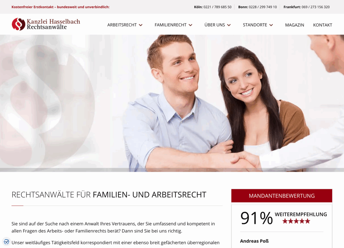 Die Website der Kanzlei Hasselbach, einer Anwaltskanzlei für Familienrecht, Arbeitsrecht und Erbrecht, ist ein gelungenes Beispiel für eine moderne Kanzleiwebsite, weil sie klar strukturiert, nutzerfreundlich und informativ aufgebaut ist.