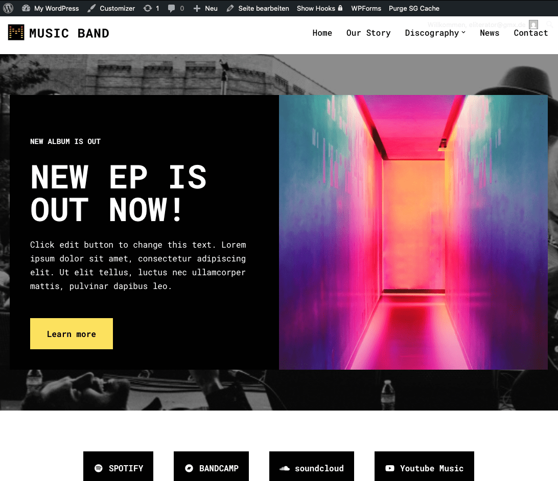 Damit du siehst, wie dein Design funktioniert, also wo du Texte und Bilder sowie Funktionen wie die Verknüpfung und Einbindung – in meinem Rock-Band-Beispiel – von Spotify- oder YouTube-Inhalten managen kannst, sind aber einige Beispiel-Inhalte schon vorhanden.