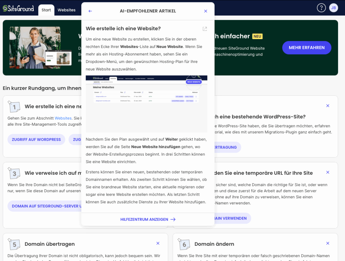 Hast du deine WordPress-Website mit SiteGround erstellt, solltest du dich zunächst einmal im Backend umschauen. Hier stellt dir der Anbieter übersichtlich ein paar mögliche erste Arbeitsschritte vor, etwa eine Voransicht deiner Website, das Erstellen neuer Seiten oder die Änderung des Designs.Wenn du dir noch sehr unsicher bist, kannst du auch die WordPress-Tutorials oder die Wissensdatenbank mit mehr als 1.000 hilfreichen Artikeln besuchen. Zudem steht dir ein auf ChatGPT basierender KI-Chatbot zur Verfügung. Dazu einfach auf das Fragezeichen rechts oben klicken.