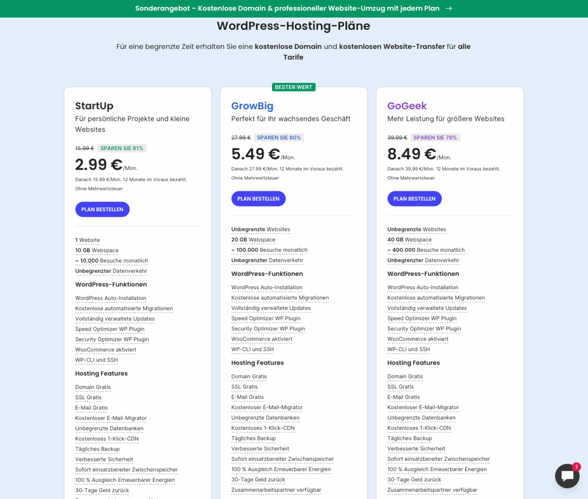 Ein komplett kostenloses Website-Angebot gibt es bei SiteGround nicht. Der Einstieg ist aber günstig, und im Preis sind Domain und E-Mail-Adresse sowie Features wie tägliche Backups, SSL-Zertifikate und ein leistungsstarker Caching-Service bereits enthalten.